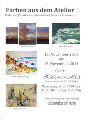 La mostra - dal titolo "Farben aus dem Atelier" - si è svolta presso la galleria Vierraumladen di Berlino dall’11 al 13 novembre. Hanno partecipato quattro artisti del gruppo internazionale “Handwerker der Farbe” : Laura Facchinelli, Gotthard Krupp, Magda Kozuch, Klaus-Jürgen Wittig.
