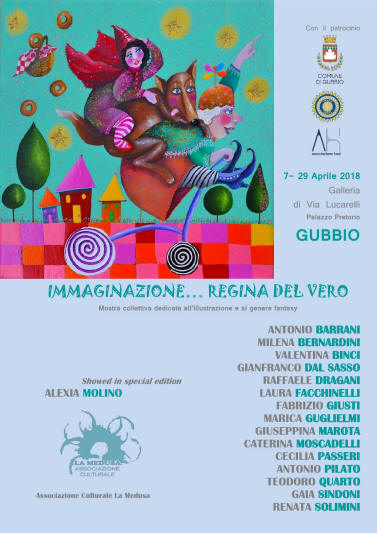 Lucarelli di Gubbio, 2018 La Mostra “Immaginazione … regina del vero”, dedicata all’illustrazione e al genere fantasy, č stata organizzata dall’Associazione Culturale La Medusa e si č svolta nella Galleria Lucarelli, Palazzo Pretorio, di Gubbio dal 7 al 29 aprile 2018.
